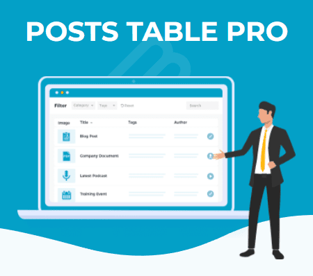 Posts Table Pro lists posts, pages, custom post types, custom fields, taxonomies, and more. All easily, all automatically.